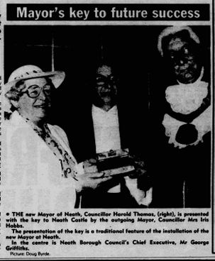 It was Mrs Hobbs who provides us with our final definite record of the key, when she handed it over to the incoming Mayor for 1987-88, Mr Harold Thomas. Photographed for the Neath Guardian of 29th May 1987, the key is seen in a handsome presentation box and we are told that ‘the presentation of the key is a traditional feature of the installation of the new Mayor of Neath’.