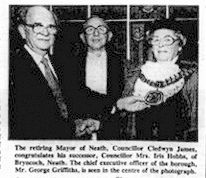 Following the timeline of these articles it was fascinating to see changes in social attitudes: the rise and fall of political parties, women being featured in the reports, and finally even elected as Mayor. The first woman to be elected Mayor of Neath was Hilda Howells in 1964, closely followed by Mary Moule the following year. However, it was not until 1986 that the third woman was appointed Mayor, being Mrs Iris Hobbs.